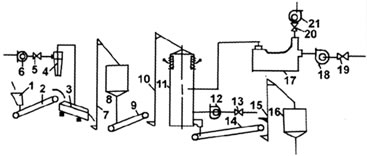 15.提升機(jī) 16.后儲(chǔ)倉(cāng) 17.熱風(fēng)爐 18.熱風(fēng)機(jī) 19.風(fēng)量調(diào)節(jié)器 20.風(fēng)量調(diào)節(jié)器 21.引風(fēng)機(jī)
